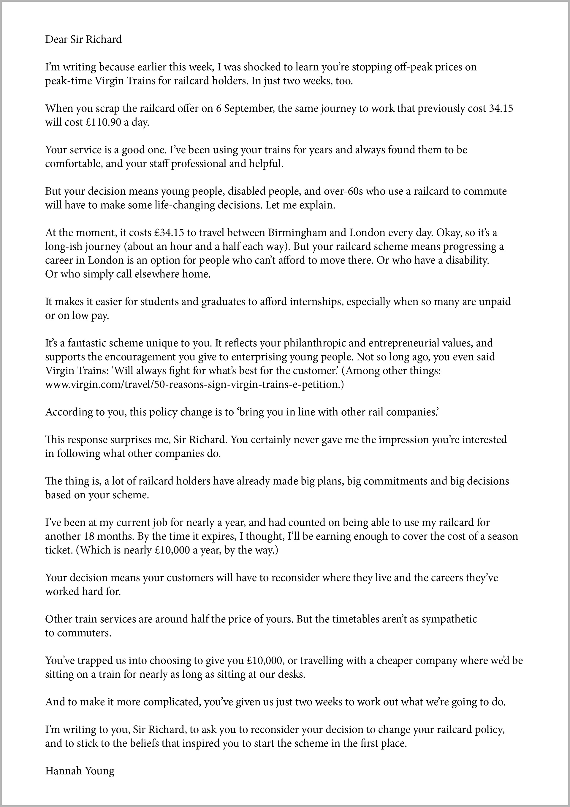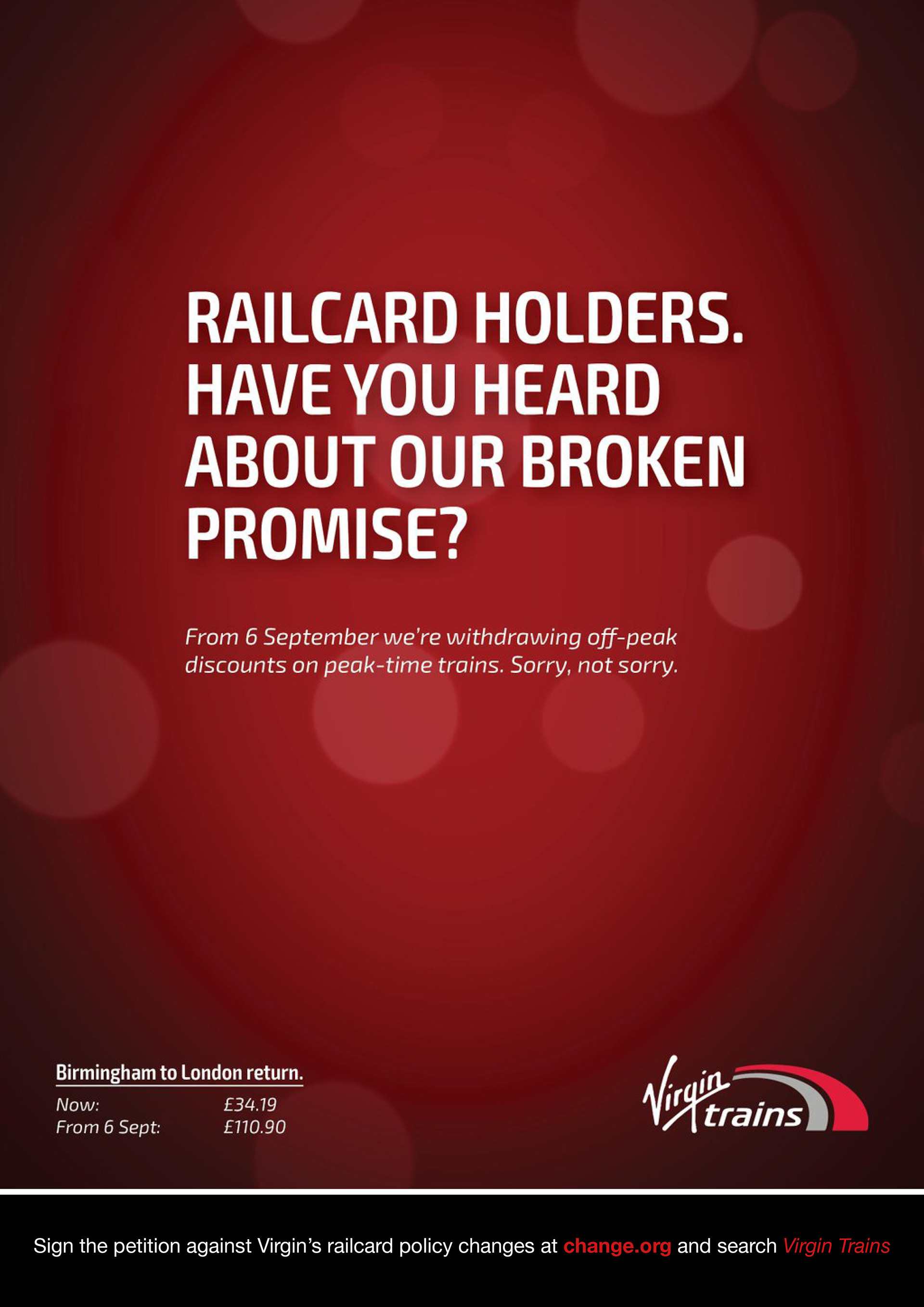 One day in 2015, Virgin Trains (very, very quietly) whispered that they were withdrawing 16-25 railcard perks on peak-time travel. In just two weeks. Young people just starting out in their careers were affected. At incredibly short notice, everyone who relied on their railcards for just-about-doable travel would have to fork out £10,000 for a season ticket, move away from friends and family, or lose their jobs. So we wrote letters like crazy, and ran a Twitter campaign. Unfortunately, Virgin Trains stuck with the silent treatment. The changes went through anyway. But we got lots of coverage online, in national papers, and on local news programmes. And we got huge support from the general public, and thousands of petition signatures.